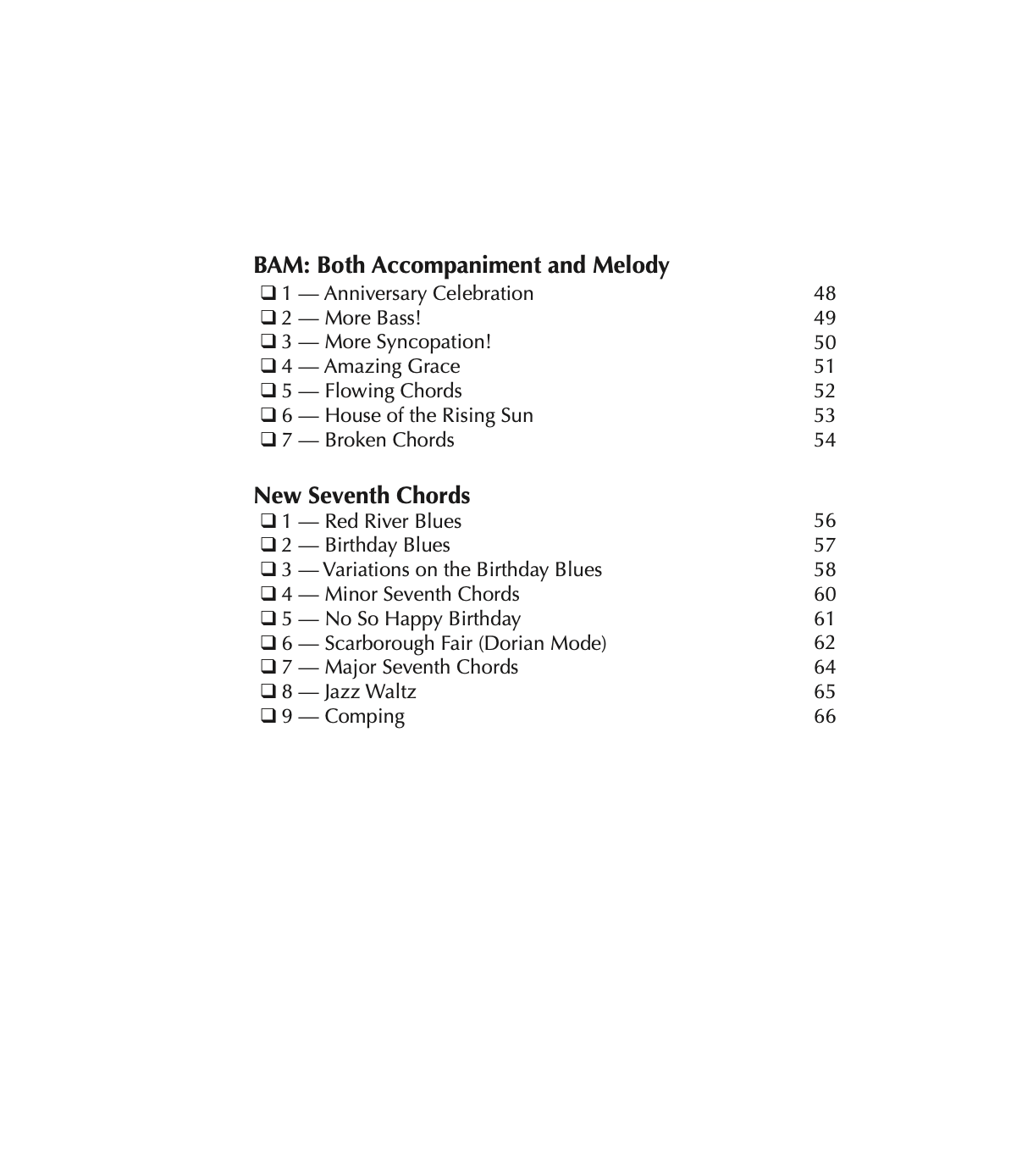 Continue to explore ways to make rich-sounding accompaniments at the piano. Learn to play baselines with the left hand, and how to style the chords played with the right hand in various ways. Learn about inversions, slash chords, seventh chords, and a few other chords such as suspended and altered chords.
